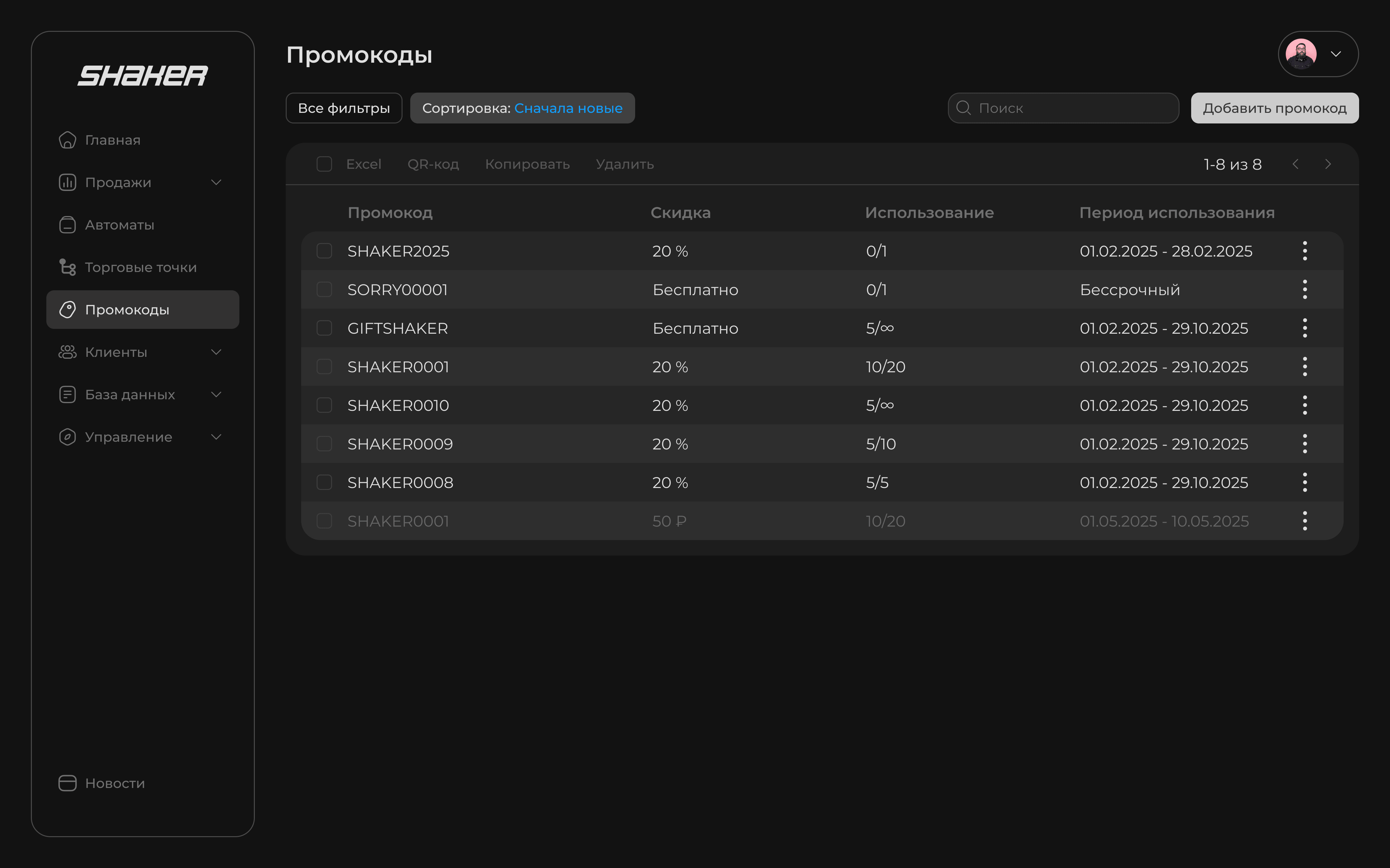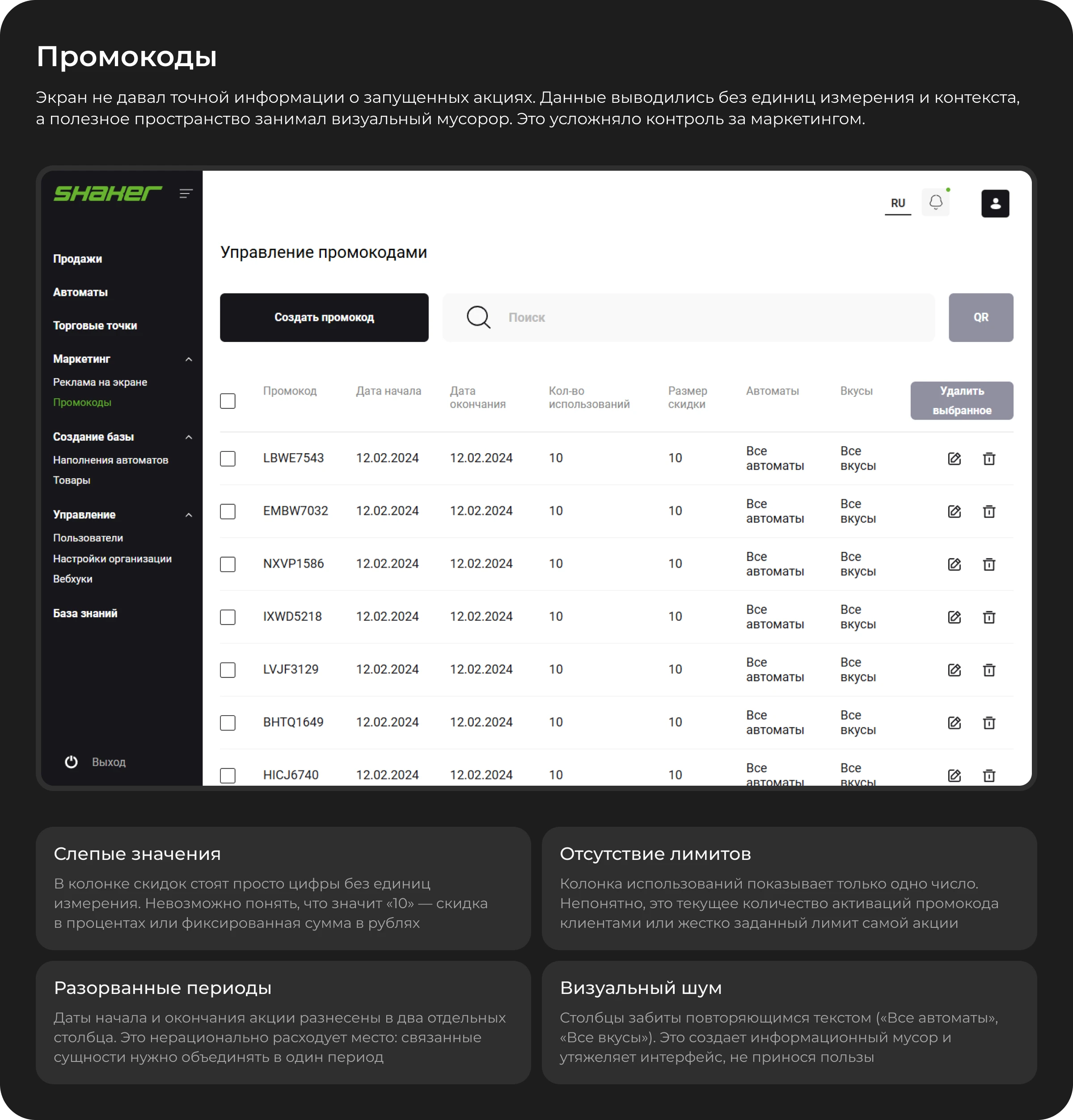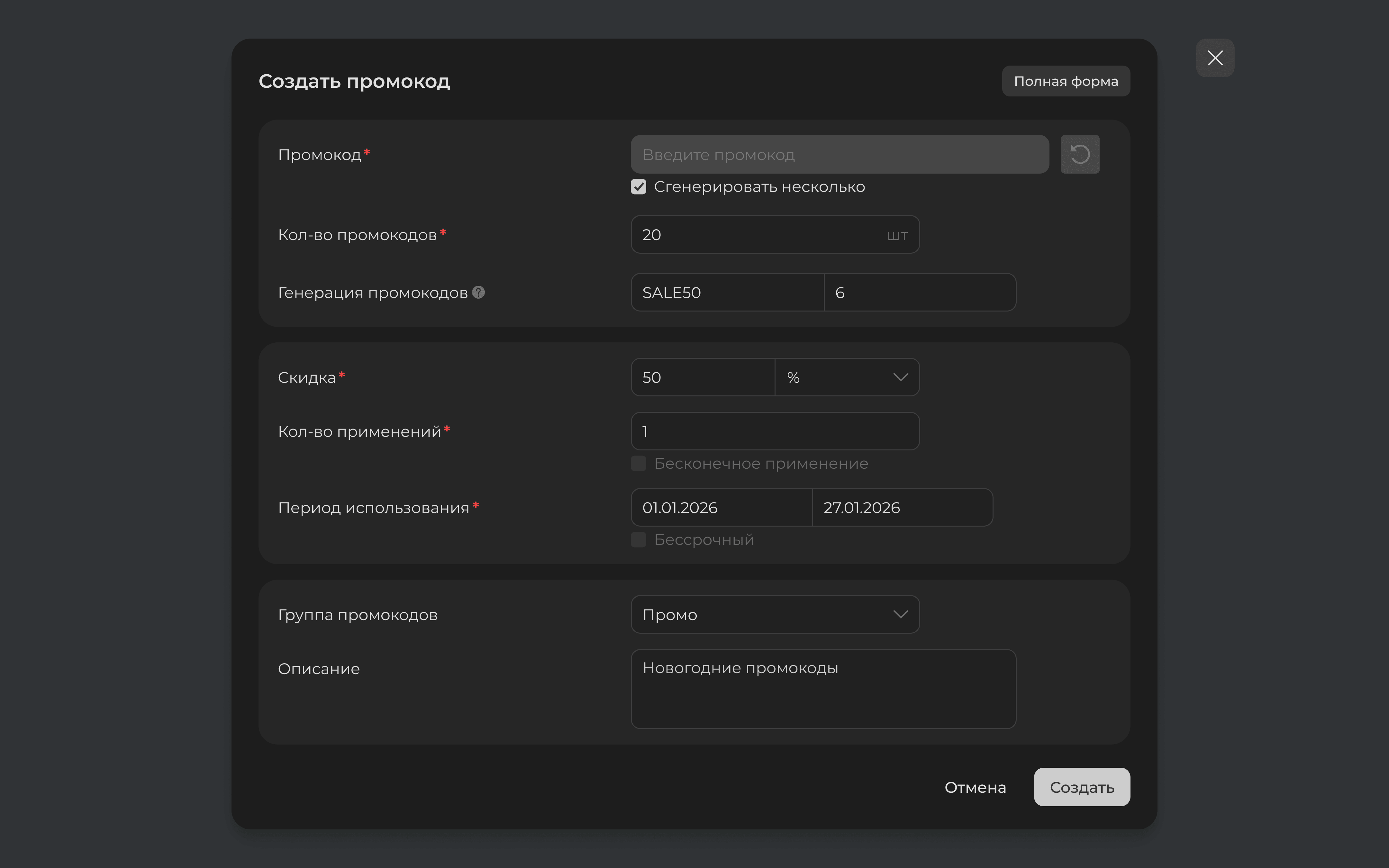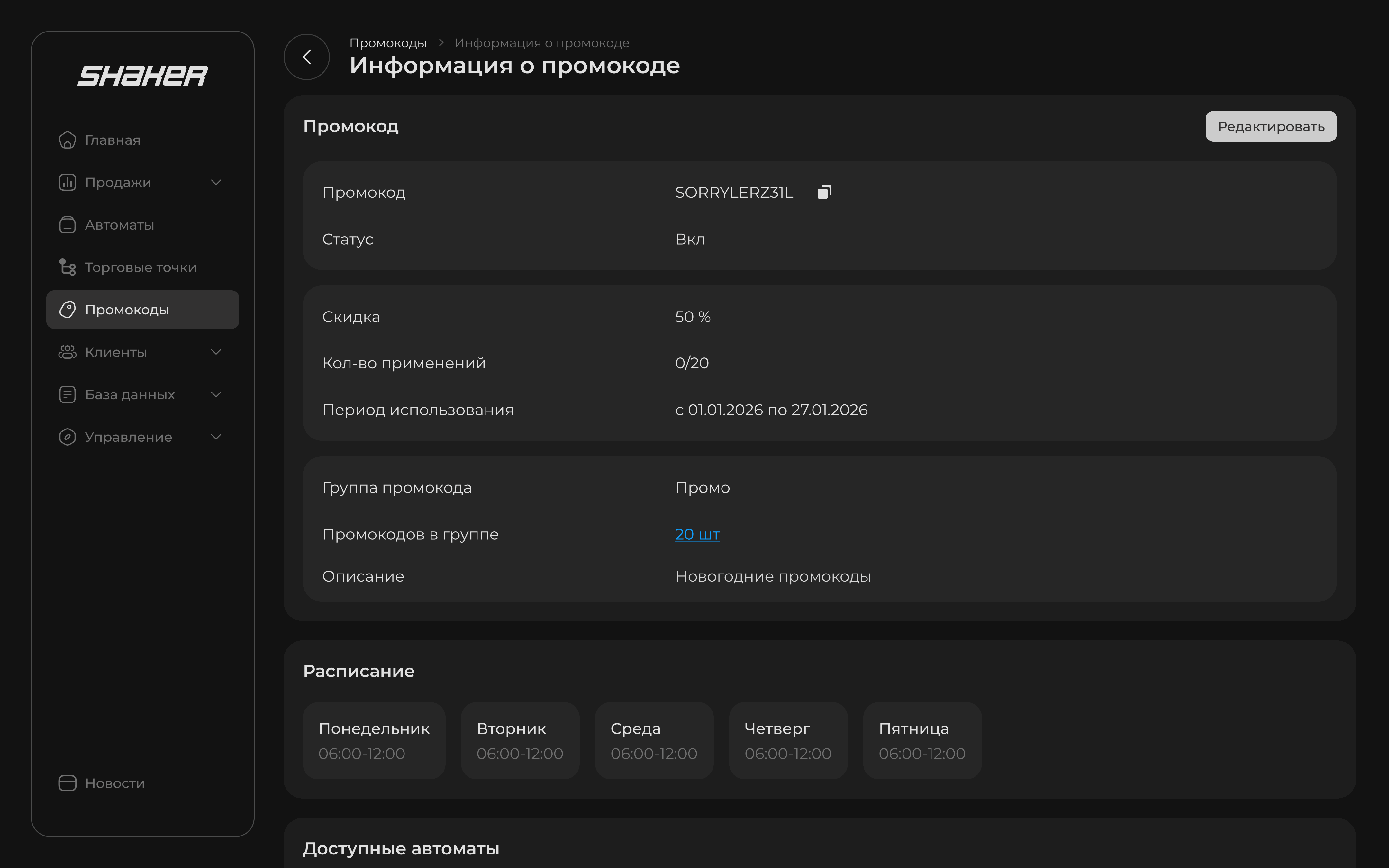 Бизнесу нужен был инструмент для стимулирования продаж и возврата клиентов. Мы спроектировали модуль промокодов, который позволяет запускать как массовые акции, так и точечные кампании.