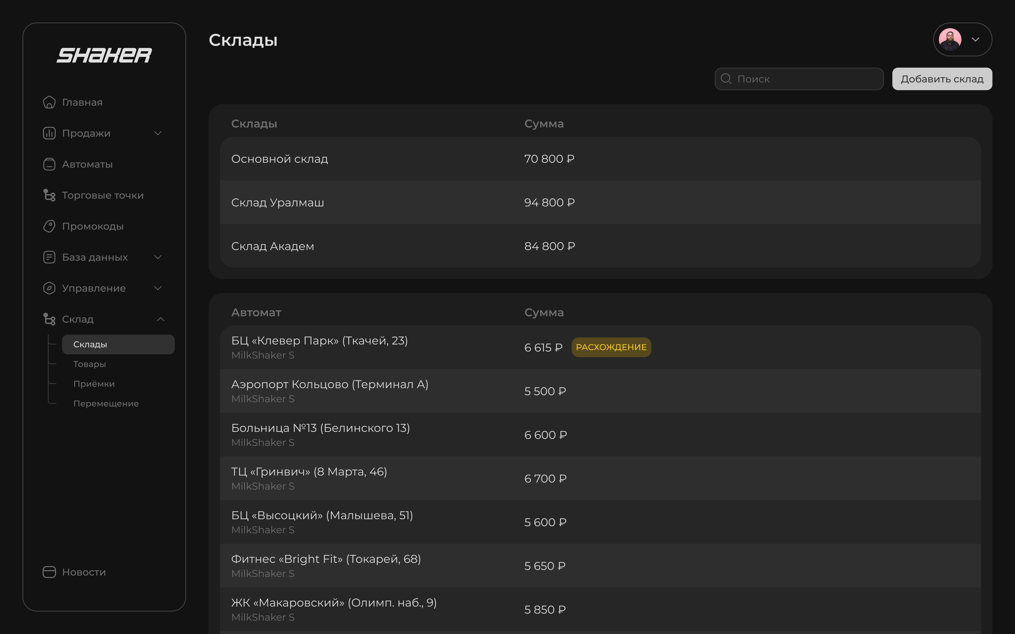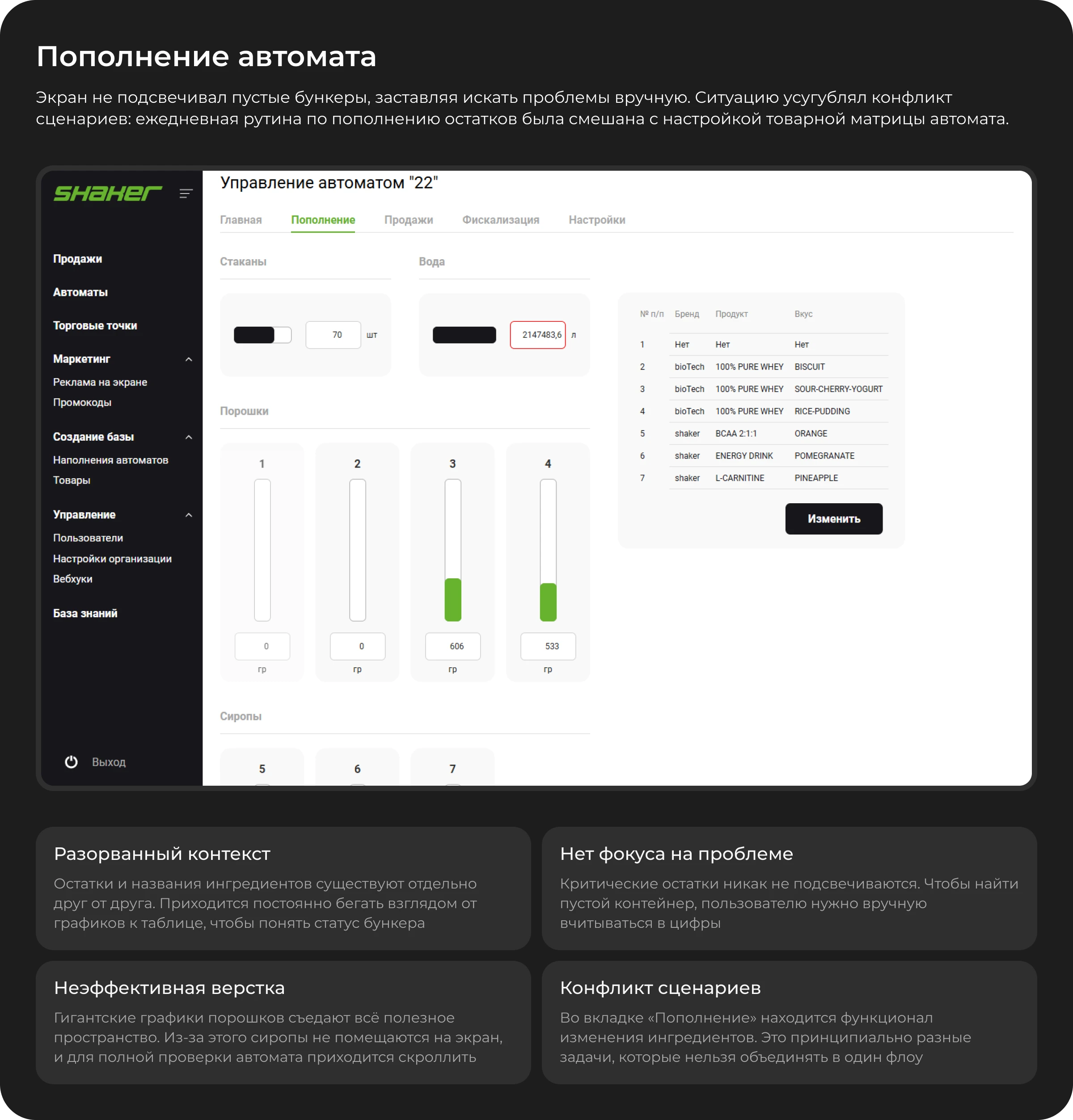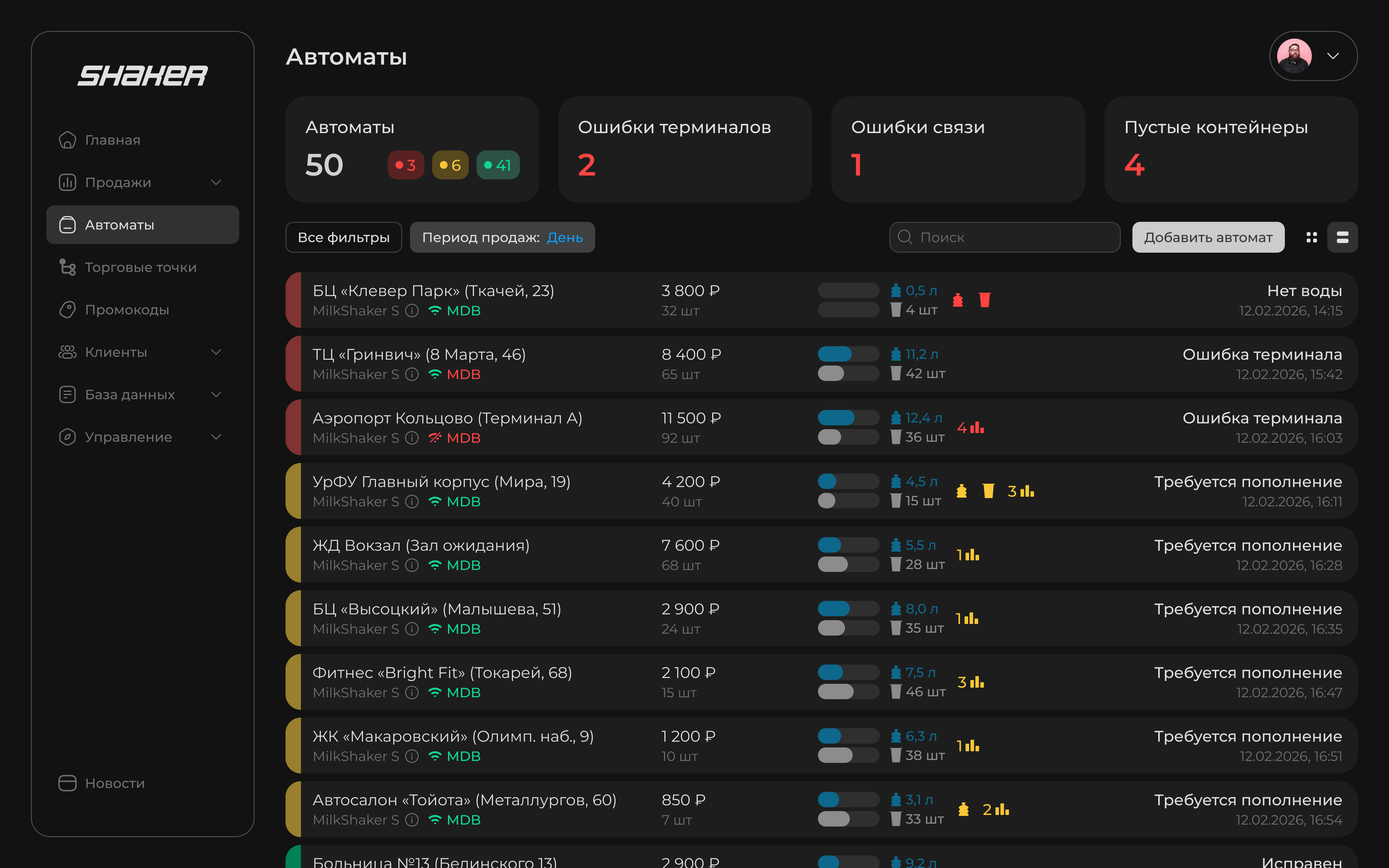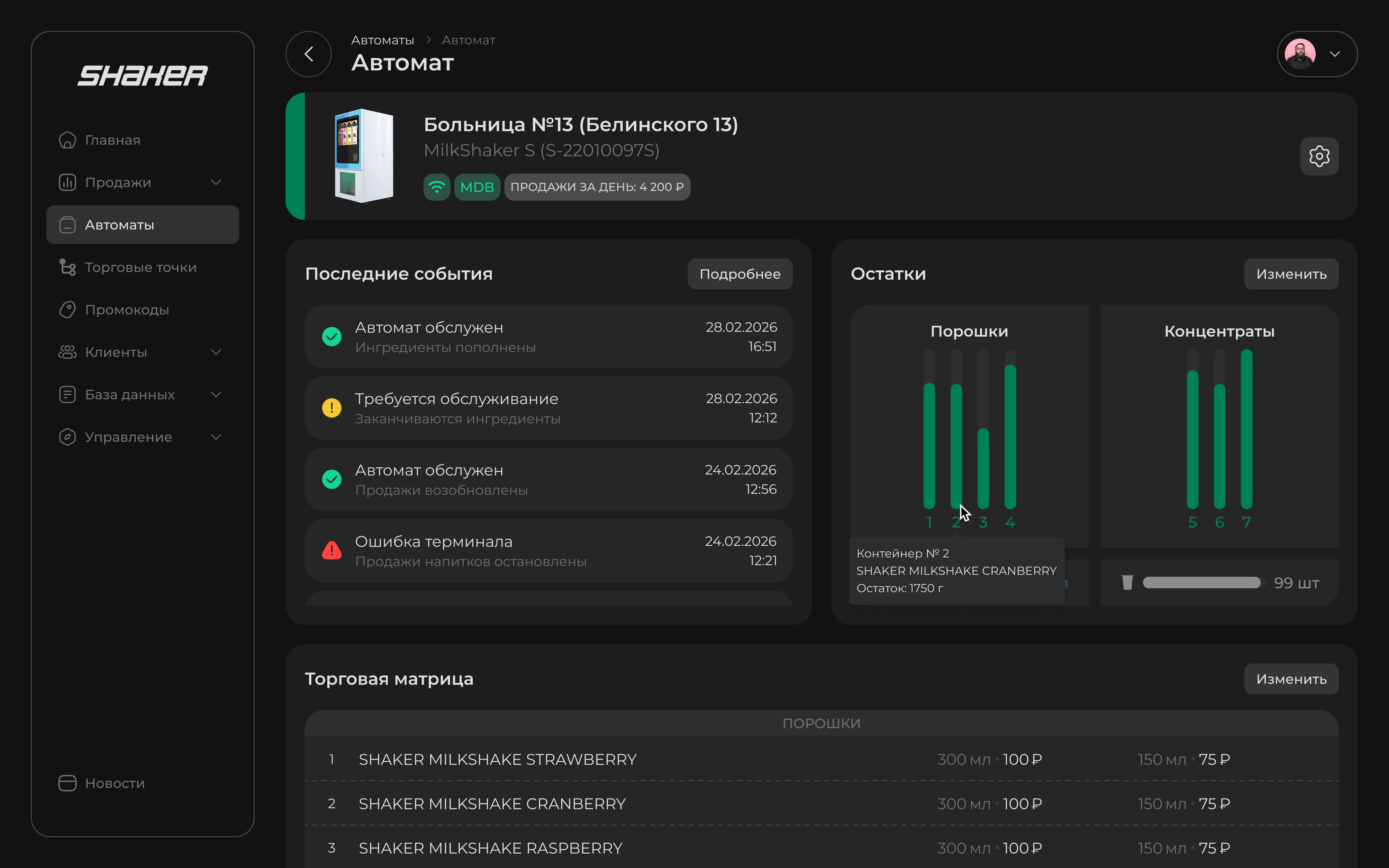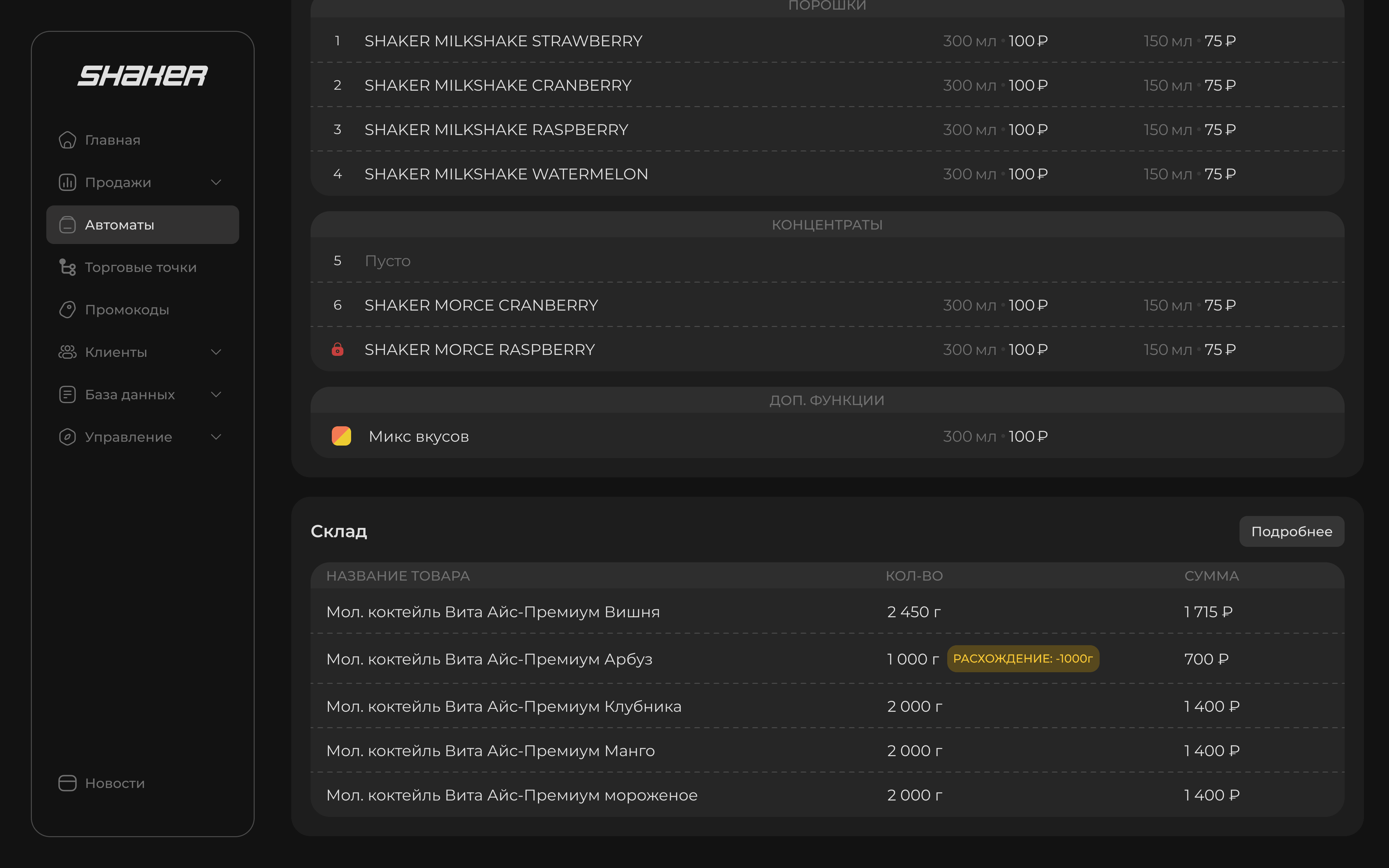 Чтобы минимизировать «серые» потери, мы внедрили легкий складской учет. Каждый автомат стал виртуальным микро-складом. Система автоматически сверяет фактические остатки ингредиентов с выручкой и моментально подсвечивает аномалии.