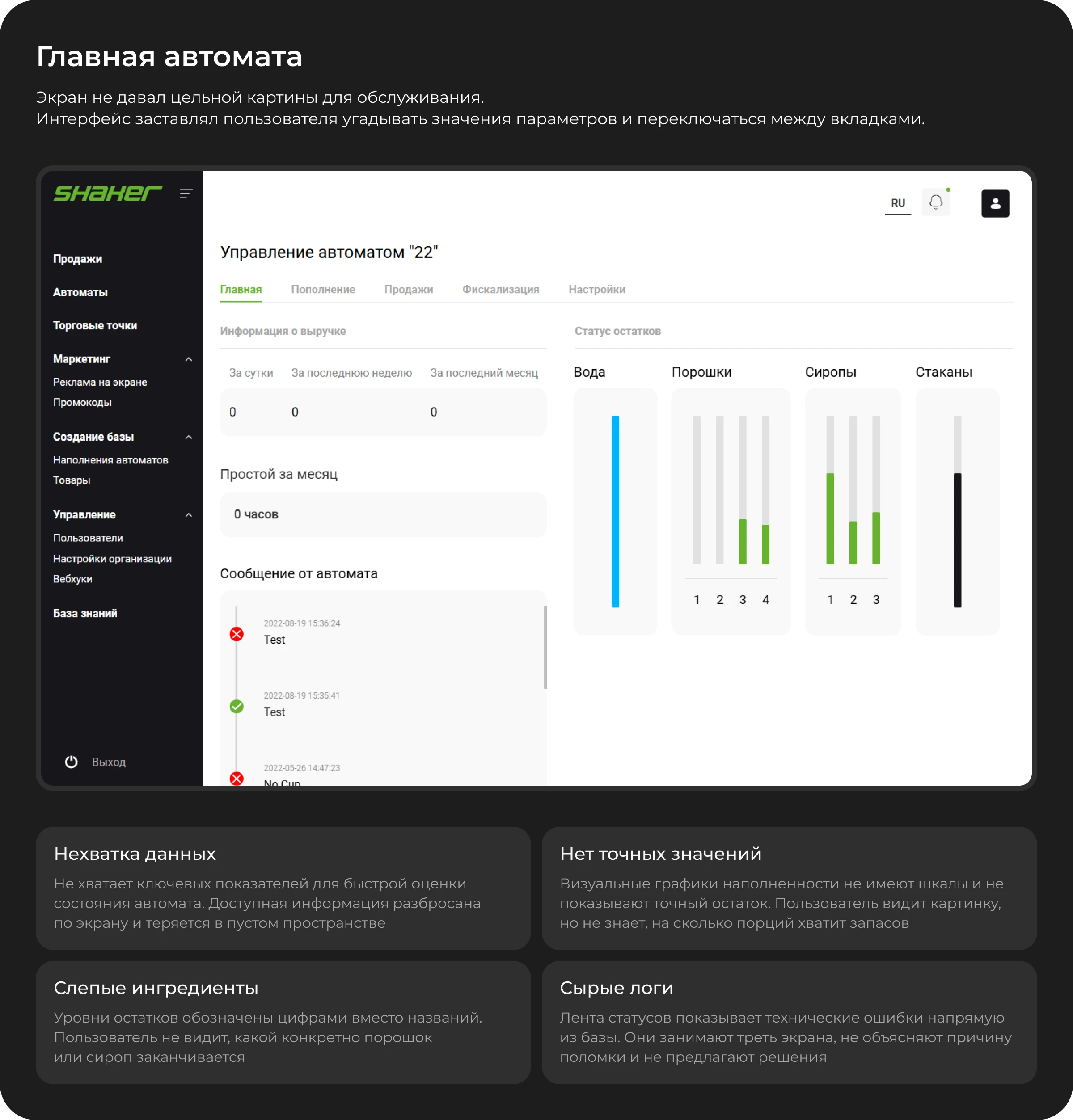 Главная причина звонков в саппорт — техническая слепота. Я избавился от сырых логов и безымянных графиков. Теперь система показывает точный уровень конкретных ингредиентов и переводит системные ошибки в понятные инструкции