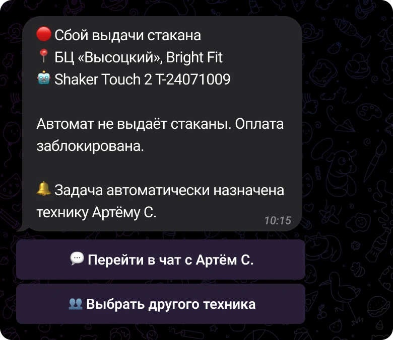 Владельцам и техникам больше не нужно дежурить у монитора. Система сама выявляет критические сбои и превращает мессенджер в мобильный пульт управления. Платформа берет на себя роль диспетчера: она не просто констатирует ошибку, а сразу запускает процесс её решения.