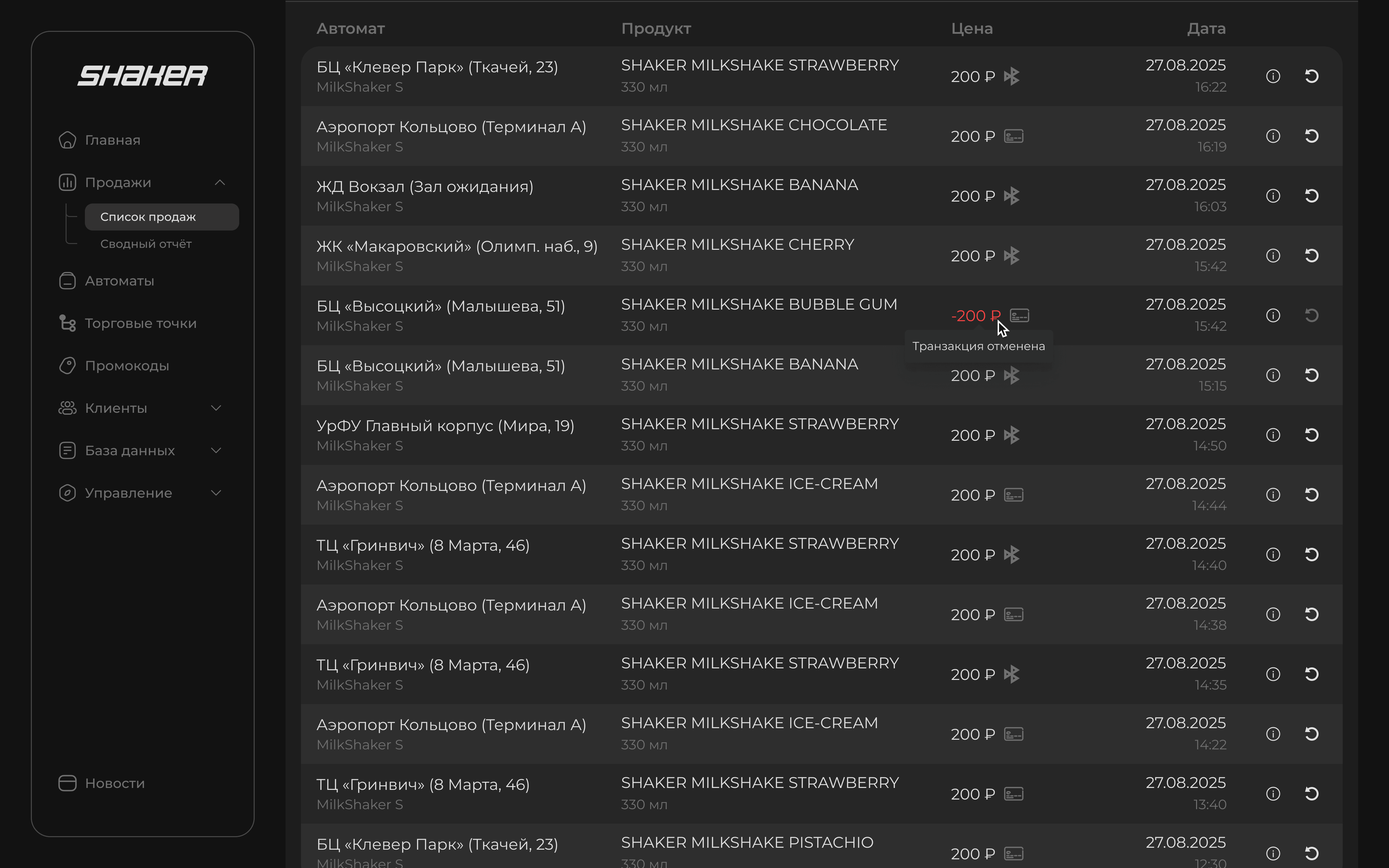Если автомат не выдал напиток, оператору больше не нужно искать платеж в банковской системе. Вся история транзакций, типы оплат (NFC, QR, карта) и статусы находятся под рукой. Оформить возврат клиенту можно прямо из строки заказа за пару секунд.